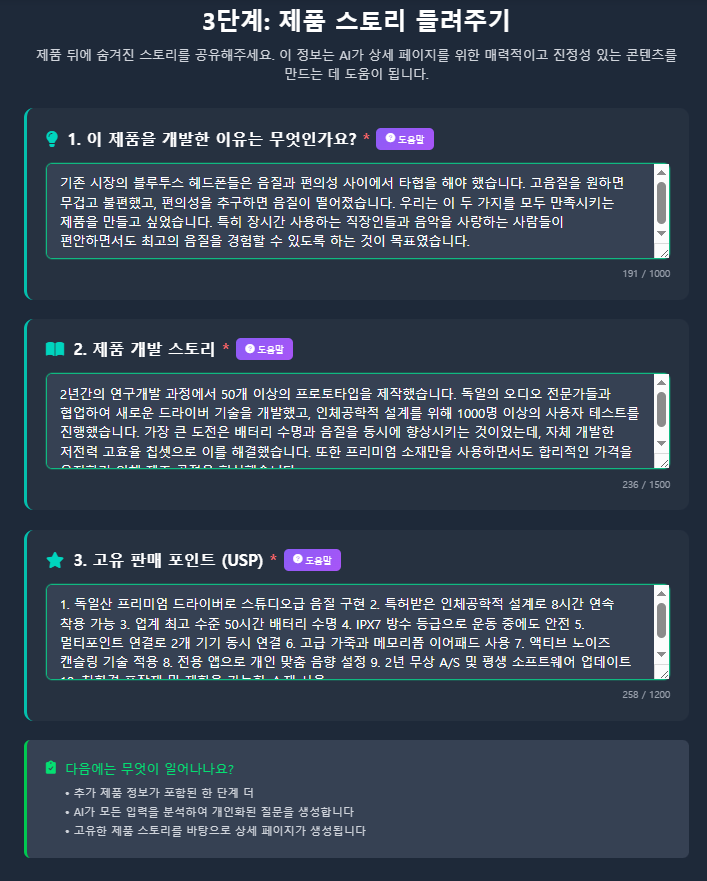 특히'제품 상세 설명'과 '타겟 고객' 부분을 자세히 작성해보시는 것을 추천합니다.